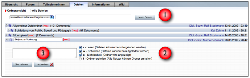 A description can be provided in the text field (3). The extended functions (2) are only displayed if the File folder permissions have been switched on (see below). If you desire to add a subfolder, first open the folder in which you desire to create the new directory. The click on “New folder”.
