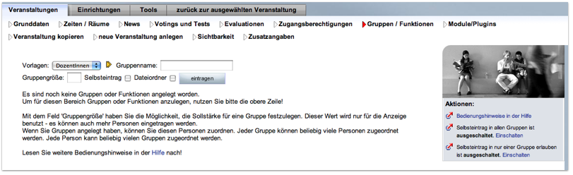 There is another possibility of automatically creating folders on the Groups/Functions page (under “Participant”->”Manage Groups/Functions”). Groups (e.g., working groups) can be set up there. A folder can be automatically set up for each group in the Document area if a checkmark has been set in the appropriate box.