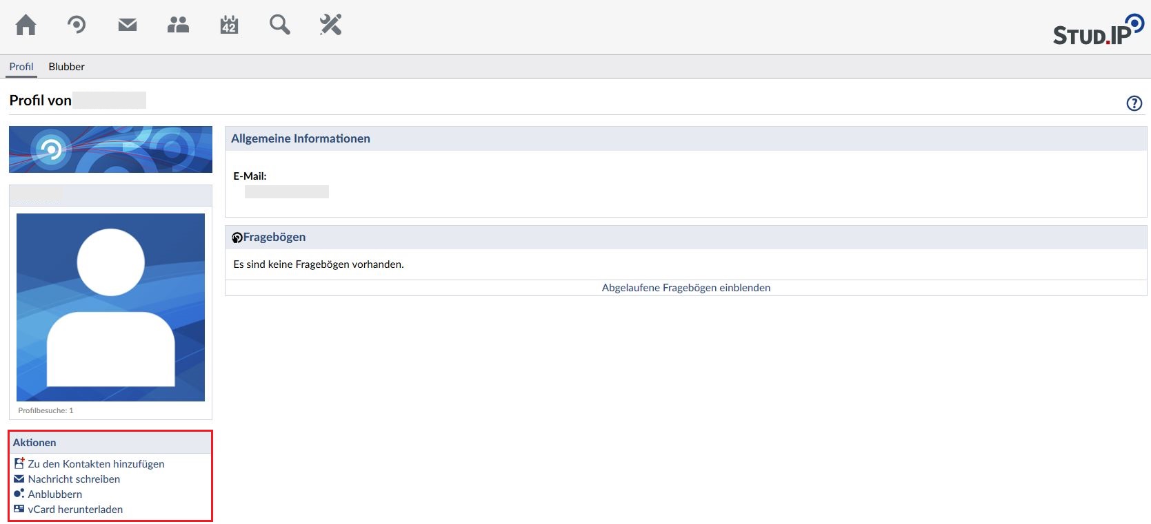Bitte beachten Sie, dass auf Ihr Stud.IP-Profil in der Regel nur andere NutzerInnen von Stud.IP zugreifen können. Eine Verlinkung aus dem Internet auf ein Stud.IP-Profil ist nur möglich, wenn Sie MitarbeiterIn einer Einrichtung sind, die ein eigenes Profil mit einer von Stud.IP generierten MitarbeiterInnenliste ist. Bei Fragen hierzu wenden Sie sich bitte an die für Sie zuständigen Administrierenden (aufzufinden über das Impressum - einfach auf den Link Impressum unten rechts klicken).