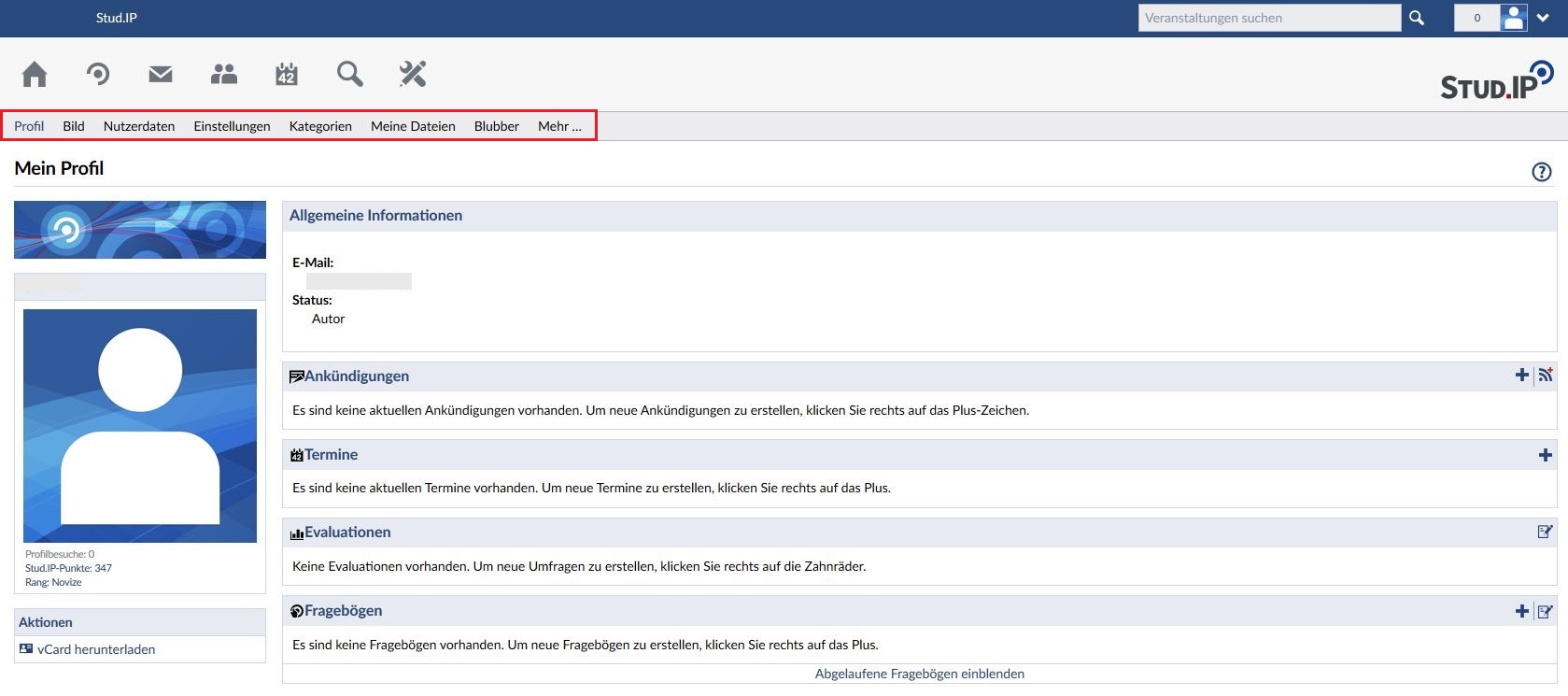 Hier haben Sie Gelegenheit, sich den anderen Nutzern des Systems zu präsentieren. Sie können ein Bild von sich hochladen, Ihren Lebenslauf oder Ihre Arbeitsschwerpunkte dokumentieren, persönliche oder öffentliche Termine, Umfragen oder News anlegen, Ihre Systemdaten verwalten und noch vieles mehr. Innerhalb bestimmter Grenzen können Sie Ihr Profil so gestalten, wie Sie es möchten und das alles ohne HTML-Kenntnisse!