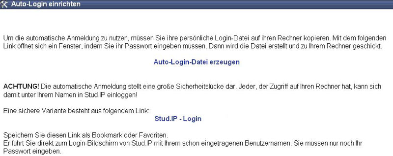 ACHTUNG! Die automatische Anmeldung stellt eine große Sicherheitslücke dar. Jeder, der Zugriff auf Ihren Rechner hat, kann sich damit unter Ihrem Namen in Stud.IP einloggen und dort z.B. Ihre Veranstaltungen unter Ihrem Namen manipulieren!Bequemlichkeit hat ihren Preis...