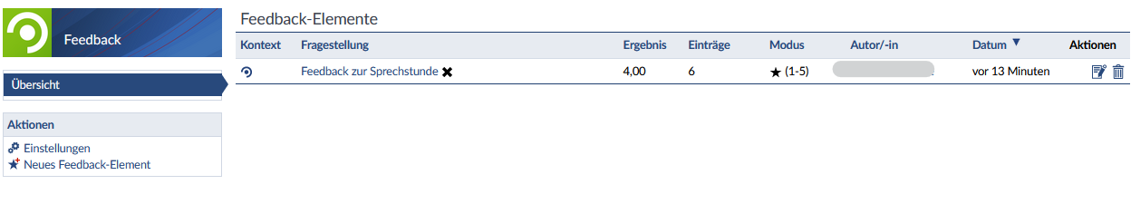 Lehrende einer Veranstaltung finden bei aktiviertem Feedback-Modul eine Übersicht über alle Feedback-Elemente und abgegebenes Feedback unter dem Reiter Feedback. Auch allgemeine Feedback-Elemente können von hier aus über Neues Feedback-Element angelegt werden: