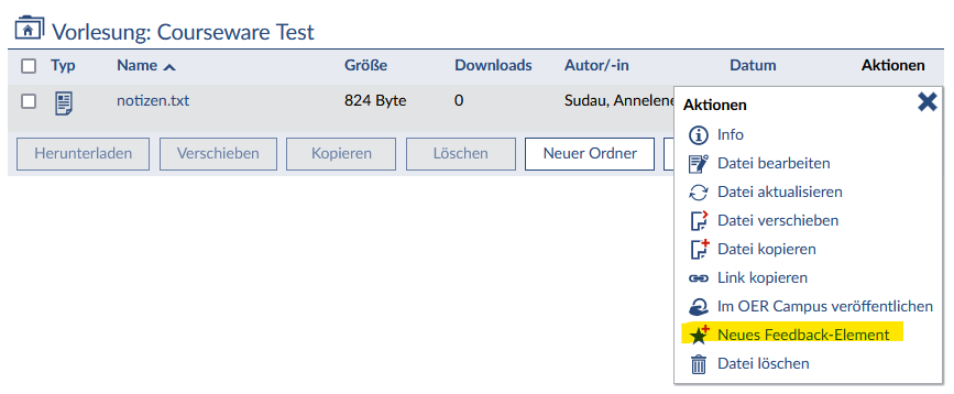 Wenn das Feedback-Modul in Ihrer Veranstaltung aktiviert ist, finden Sie im Aktionsmenu von Dateien die Aktion: Neues Feedback-Element