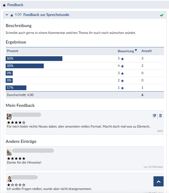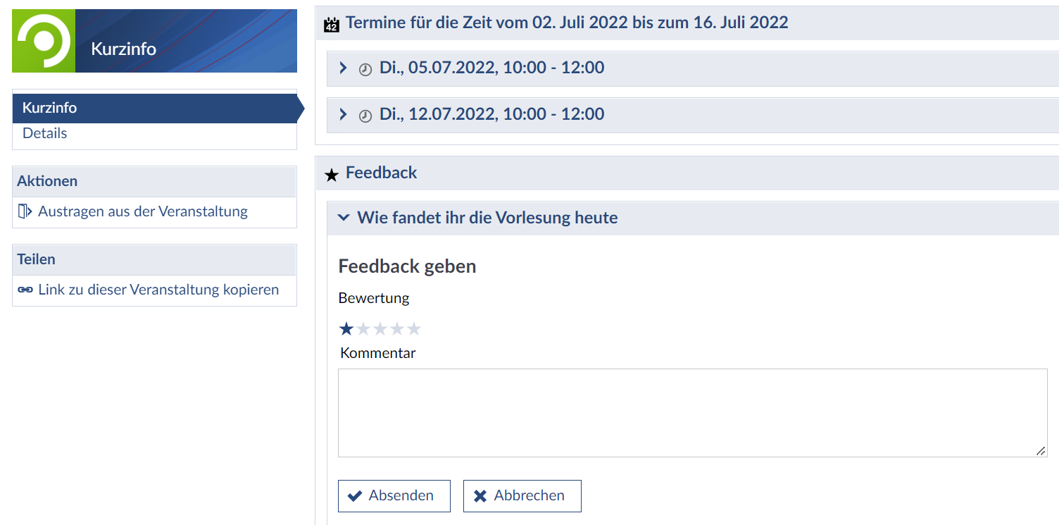 Allgemeine Feedback-Elemente finden sie auf der Übersichtsseite der Veranstaltung: