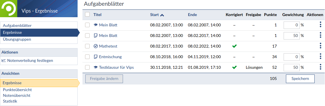 Links in der Sidebar kann zwischen verschiedenen Ansichten umgeschaltet werden. Neben der tabellarischen Übersicht der Aufgabenblätter unter "Ergebnisse" gibt es noch die „Punkteübersicht“, „Notenübersicht“ und eine einfache „Statistik“.