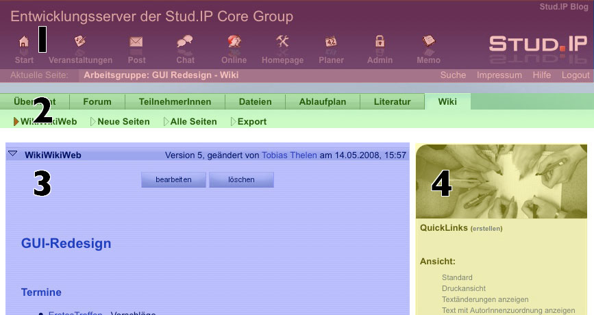 Jede Seite von Stud.IP ist auf gleiche Art und Weise aufgebaut und enthält in der Regel feste Elemente. Folgende Elemente werden wiederkehrend verwendet: