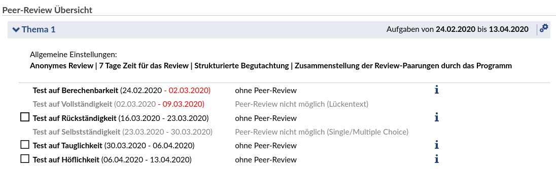 Grundsätzlich ist bei Aufgaben das Peer-Review zuerst deaktiviert. Über die Liste "Peer-Review Übersicht" können diese aktiviert werden.