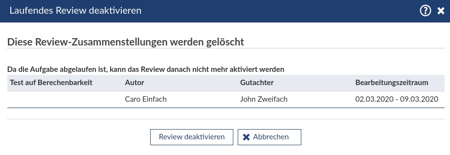 Falls ein Peer-Review deaktiviert wird, für das schon Reviews abgegeben wurden, erscheint ein Warnhinweis.
