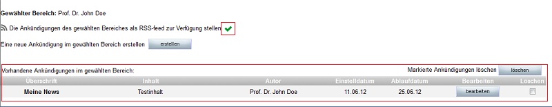 Sie erhalten die gleiche Ansicht wie oben, wobei zusätzlich die von Ihnen verfassten Neuigkeiten aufgelistet werden.