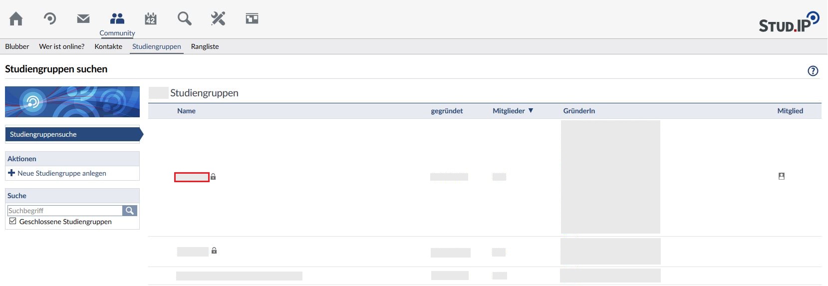 Befindet sich in der Übersicht aller Studiengruppe in der Spalte "Zugang" ein Schloss-Symbol, dann handelt es sich um eine geschlossene Gruppe, bei der Sie erst als Teilnehmender bestätigt werden müssen.