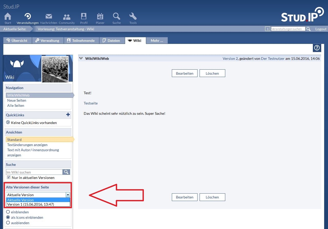 Versionen werden bei 1 beginnend fortlaufend durchnummeriert. Auf die letzten 10 Versionen einer Seite können Sie in dem Informationskasten links direkt zugreifen: