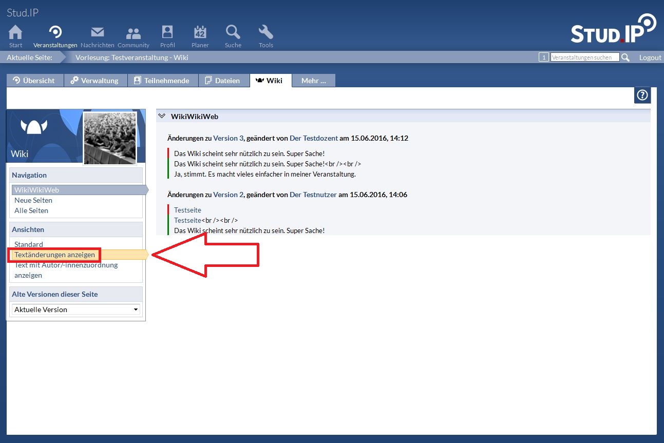 Mit der Funktion Textänderungen anzeigen bekommen Sie eine Liste der Unterschiede zwischen den einzelnen Versionen angezeigt. Gleichzeitig sehen Sie, von wem und wann die Änderungen durchgeführt wurden. Ein grüner Balken vor einem Absatz bedeutet, dass dieser Absatz in der angegebenen Version eingefügt wurde, ein roter Balken zeigt an, dass Text gelöscht wurde. (Änderungen werden nach dieser Logik als Löschen und Neueinfügen eines Absatzes gekennzeichnet.)