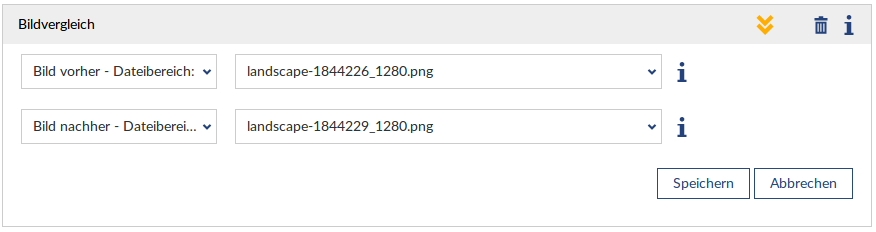 The image comparison block enables a direct comparison between two images. One picture can be superimposed on another with a slider. The images can be loaded from a URL or from the files area.