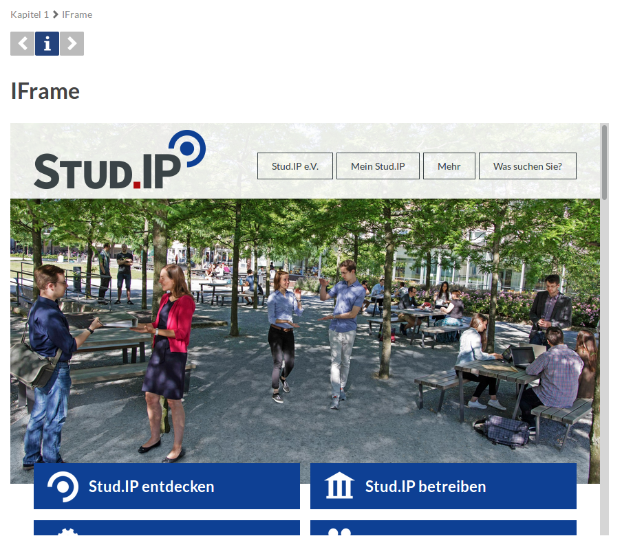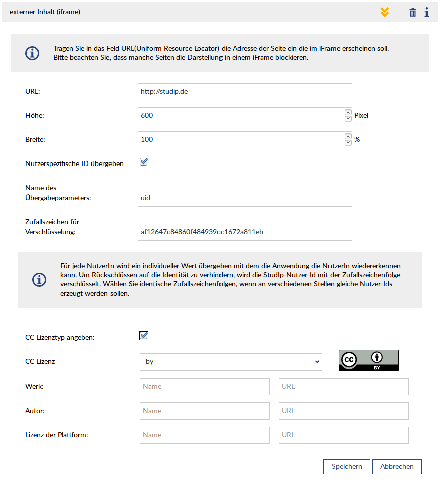 This block integrates external content from other websites. The URL of the website to be integrated can be specified, as well as the height this block should occupy. There is also the option of transmitting a unique user ID to the integrated page. This ID does not allow any conclusions to be drawn about the StudIP user, but it clearly identifies it. Creative Commons information can be used to identify the content.