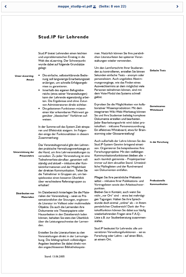 The PDF block can display PDF files from the file system. The file can be browsed through and downloaded as usual.