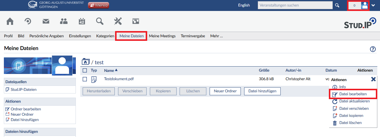 Hat sich der Status im Laufe der Zeit verändert (z.B. von „ungeklärte Lizenz“ in „Lizenz liegt vor“) so haben Sie auch im Nachhinein noch die Möglichkeit den Status zu verändern. Dies können Sie im Dateibereich machen. Wählen Sie rechts oben nach einem Klick auf den kleinen Pfeil "Meine Dateien" aus. Dort können Sie rechts unter "Aktionen" nach einem Klick auf die drei blauen Punkte "Datei bearbeiten" auswählen. Im folgenden Fenster können Sie den Lizenzstatus anpassen.