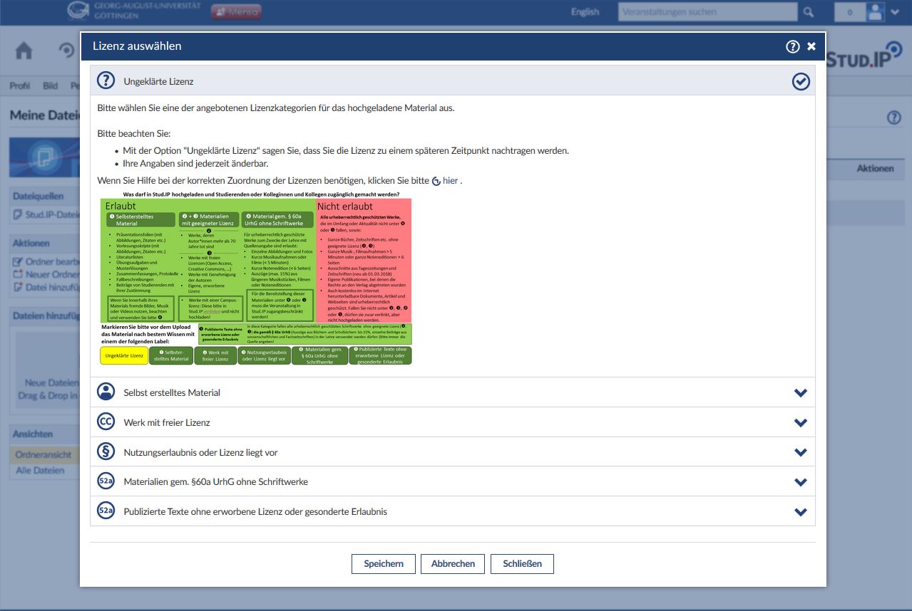 Aufgrund der neuen Bestimmungen durch den §60 ist es notwendig, die hochgeladenen Dateien mit einem Lizenzstatus zu versehen. Dies geschieht in der Regel beim Hochladen.