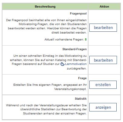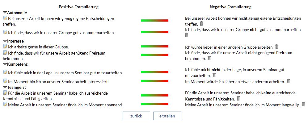Answering the motivotioring questions is the same like in school.At the screen Standard-Questions you can choose which questions you want to create- Therefor you need to choose "yes" if you want to create it and "no" if you do not.