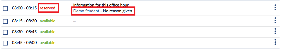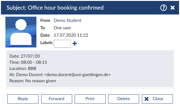 When a person reserved an office hour, you will also receive a message containing all of the important information as date, time and room of the reservation. The person, who has booked the date, is the sender of the message.