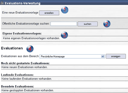 In Area 4 you see an overview of all your evaluations: those which have not yet run; those that are currently running; and those that are no longer running. If you have not yet published any evaluations, this area is empty — as in the example above.