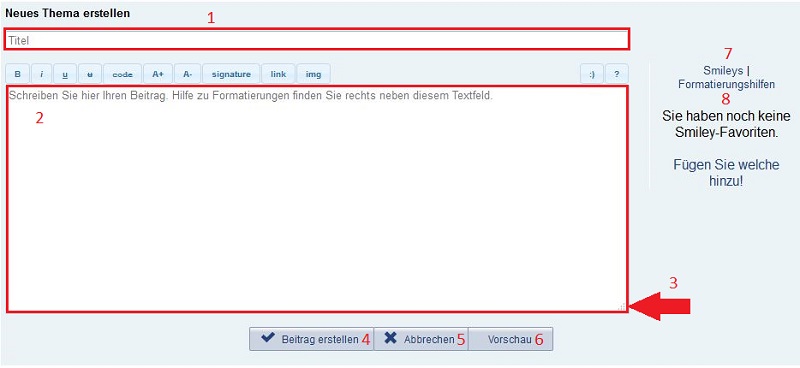 Click on “Vorschau” (6) to preview your new created topic without posting it immediately to avoid mistakes. There are two more helpful features next to the big box: