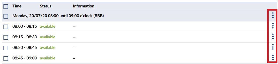 You can edit or delete just created consultation dates afterwards. If you are administering all dates of one date, you have different options available from when editing a single date. To edit the cunsultation dates, click