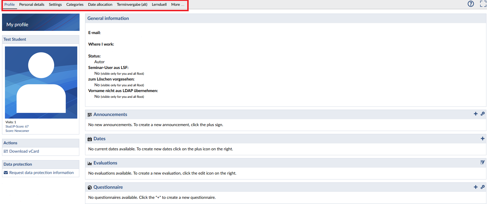 In the area next to your picture, your personal and university data will appear. For university employees, this information (organizational data) is automatically taken from EXA, and for students, the study program data is automatically displayed here. In the area below your picture, you will find a visitor counter that shows how many users have already viewed your profile. Below that, your Stud.IP score and your current Stud.IP rank are displayed. A click on these lines will take you to the score list. Additionally, you have the option to download a so-called "vCard". This contains all the data that the user has provided on their profile (name, email address, phone number, etc.). vCards can be automatically integrated into address management systems like Outlook. This entry also appears on the profile pages of other users.