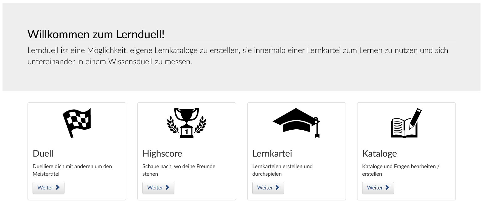 Learning duel is a plugin in Stud.IP in which users can compete with each other in quiz duels. Therefore, users can create questions on their own or use existing public questionnaires. Users can compete against random opponents or challenge with friends by choosing a questionnaire of their choice. Alternatively, users can use questionnaires as que cards and learn them on their own. Docents can create questionnaires and share them with their students.