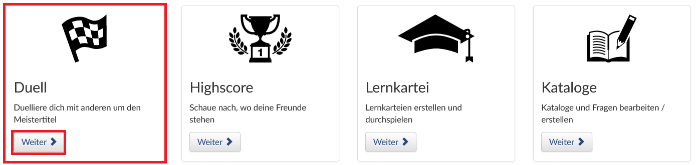 In a duel you can compete with other users. You can decide, whether you would like to compete with an unknown person or a person of your choice. To use this function, click [Weiter] ("go") in the field "Duell" ("duel").
