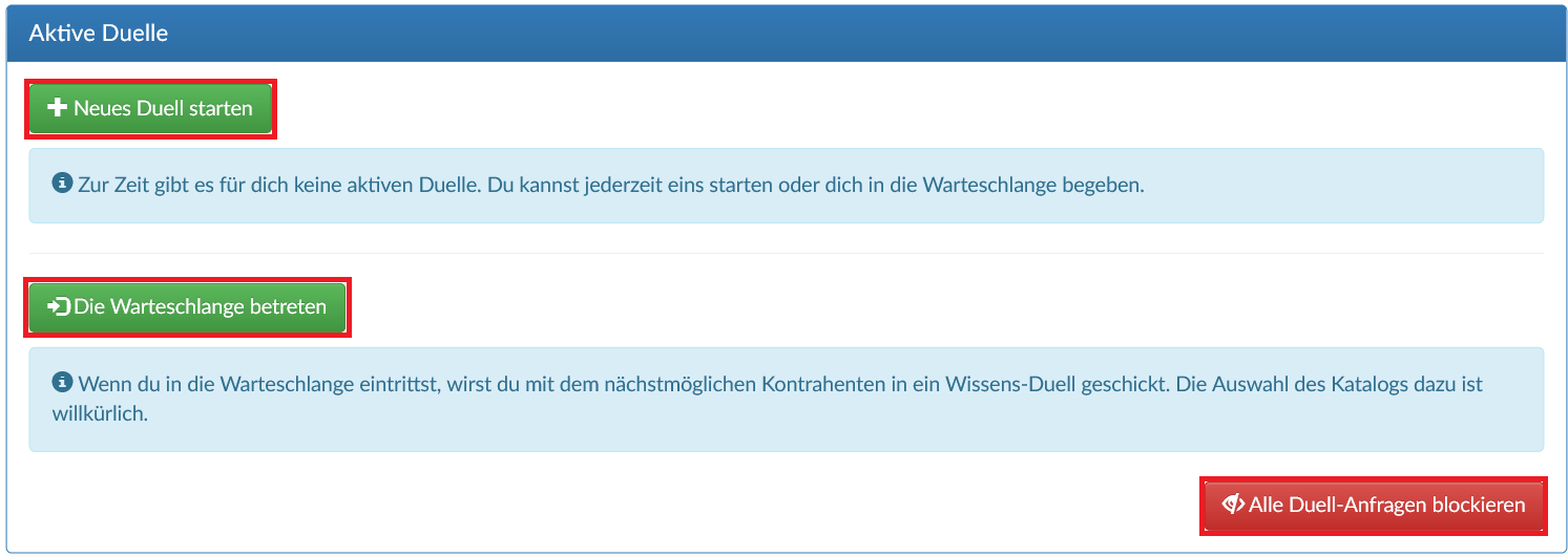 You can see three options in the overview: With [Neues Duell starten] ("start new duel") you can start a duel with a person of your choice. By clicking [Die Warteschlange betreten] ("enter queue") you can compete with unknown users. If you do not want to receive duel requests at all, click [Alle Duell-Andragen blockieren] ("block all duel requests").