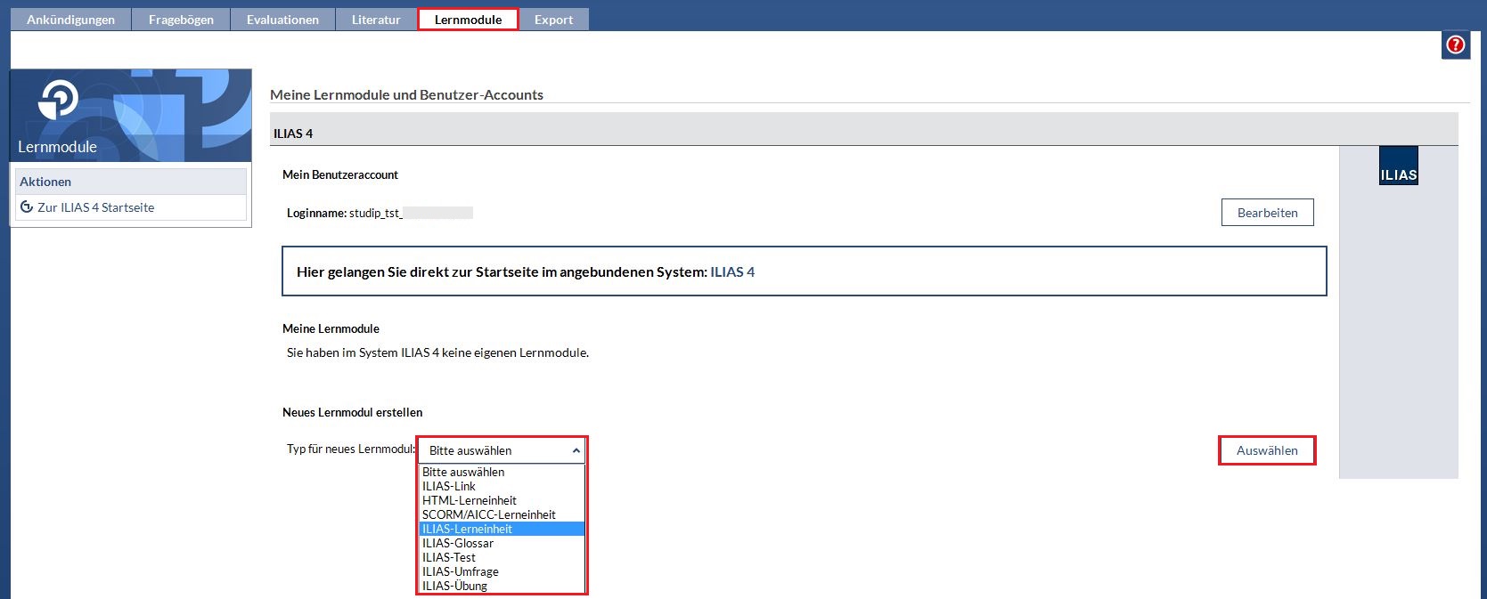 When you dont use a finished learning module (or upload one in ILIAS) you have to choose one of the last four modul typs. That is depending on your needs. After you choosed a learning modul from the drop down list you have to confirm it with the button "select".