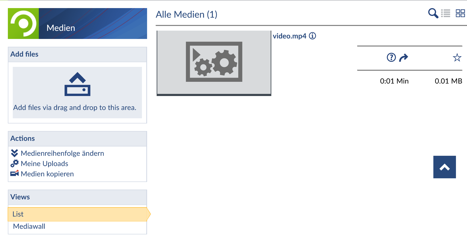 You can see the preview picture, the date of upload and who has uploaded this file. By clicking the preview picture, the video will start playing. Besides that, you can see the name of the video and an info button. By clicking the name, you can edit the video settings. Click the info button, to view information about the license, playtime, format etc.