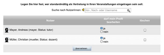 At this poin, lecturers can stipulate people who are to routinely serve as their substitutes, i.e. who are automatically registered in courses as substitutes.