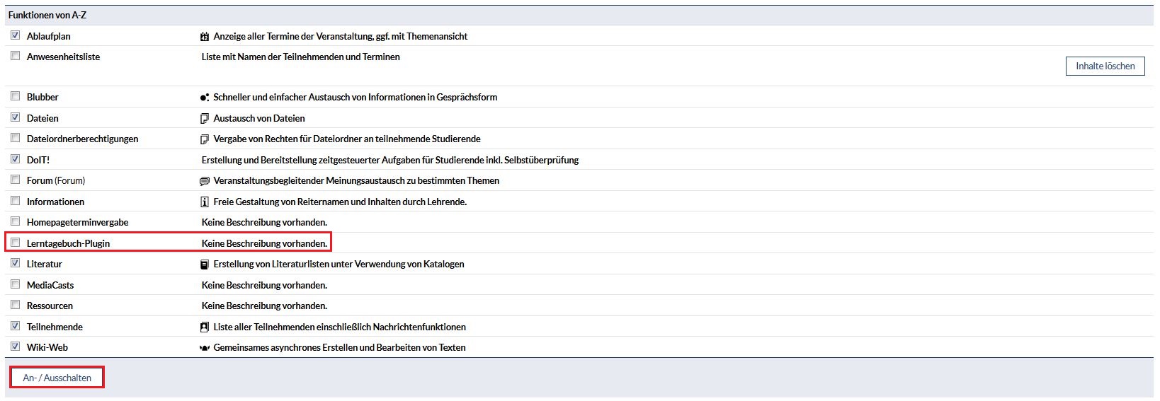 At the administration page of the plugin the functions of the learning journals for the corresponding course get configured.