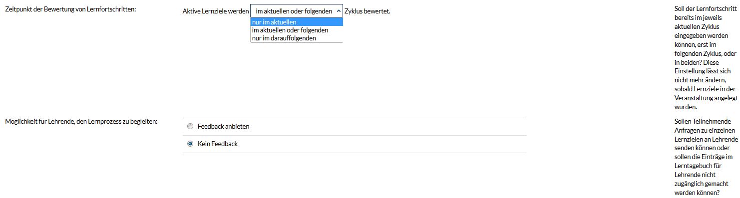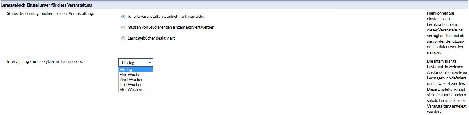 The Interval length defines in what oitch study goals within the learning journal will be defined and graded. This option can not be changed as soon as study goals got set.