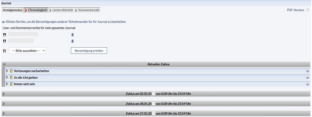 Within your journal you have the posibility to talk with lecturers or other participants about the learning progress.