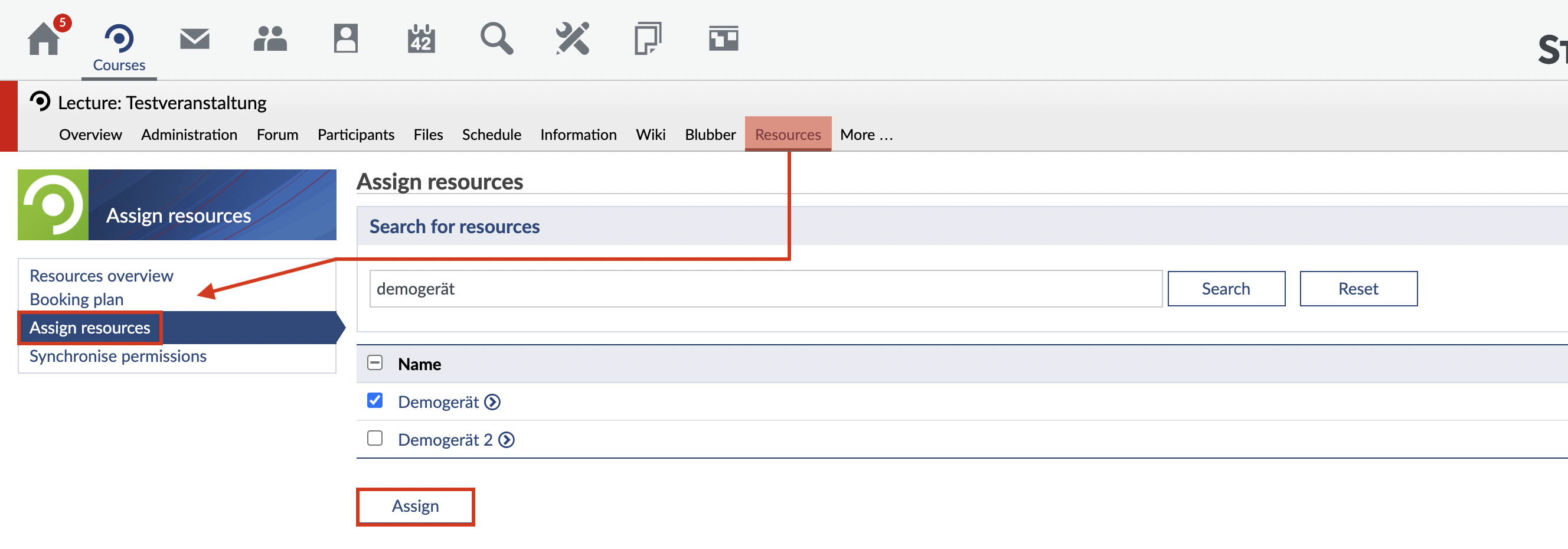 After adding the tab Resources in your event bar, you have to assign resources. Therefore you search for a resource by entering text. Now, put a check at the respective resource and press assign for adding it to your event.