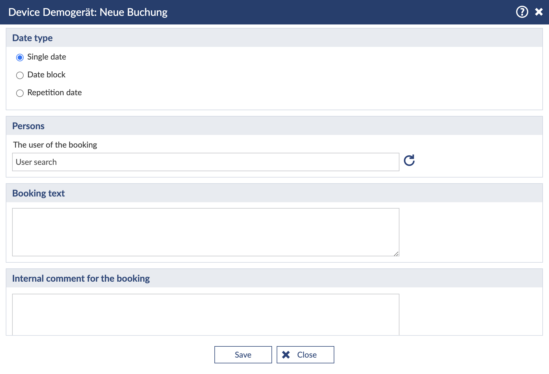 Next, you can choose the date type. You can choose between a single date, a date block or a repetition date. A single date is a one-time booking. By choosing a date block you can request a recurring booking of the resource for certain days. A repetition date is selected if the resource should be booked regularly on certain days. In order to finalize the booking, you must either enter a person using the booking or write a booking text.