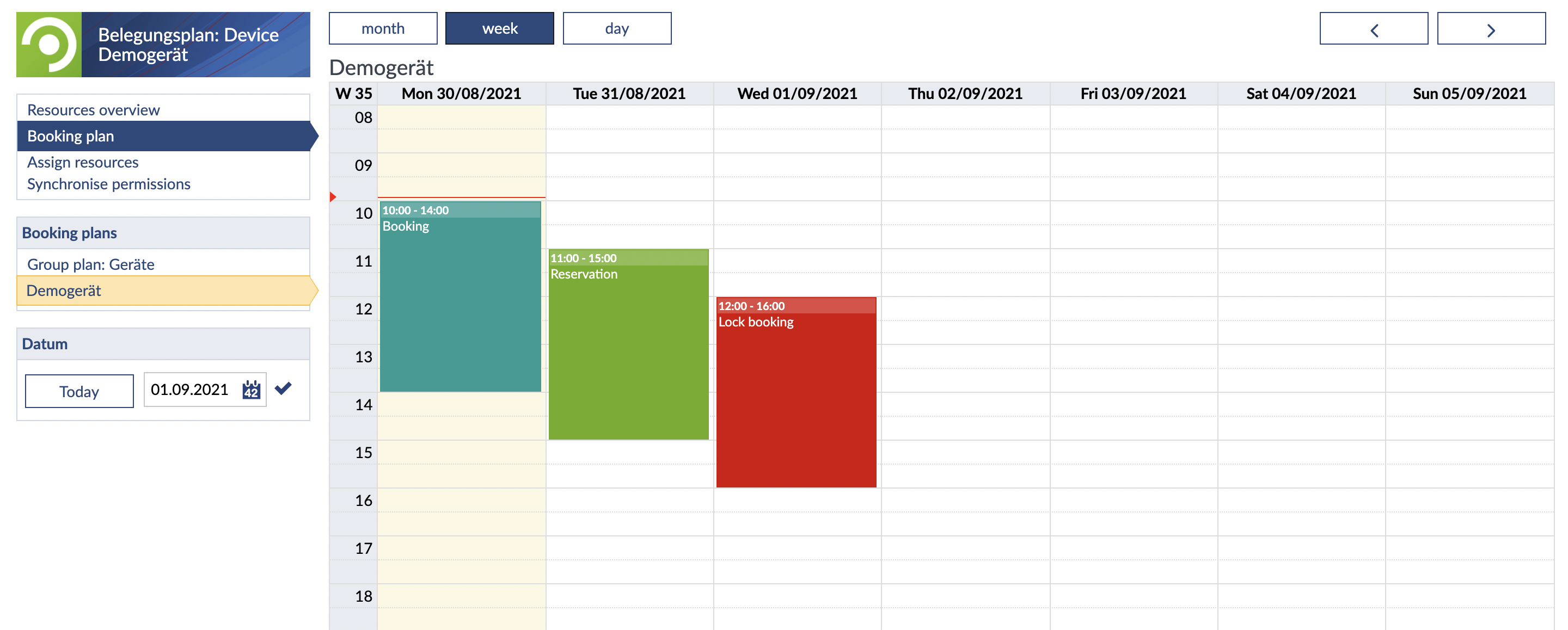 Afterwards you can overview your bookings in the booking plan. In this example there is one booking, one reservation and one lock booking. As the resource manager, you can edit or delete these at any time by clicking on the respective booking box.