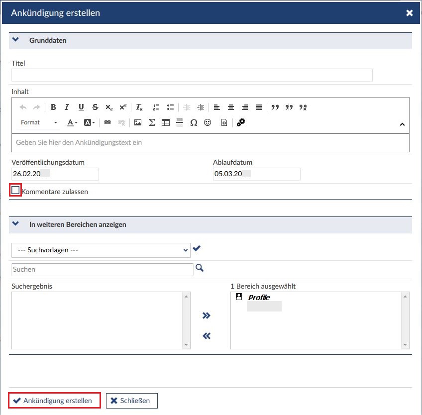 If you want to create an announcement via your profil page, it automatically is set, that the announcement will be shown on your profil. If you are a tutor of a course or even the lecturer of a faculty you can also let the announcement be shown there. Therefore click on "Show in other areas" and you can look for faculties via the button "search tamplets" or look for them via the search option. On the right you can see where your announcement will be shown exactly. Click on "create new announcement" in the end.