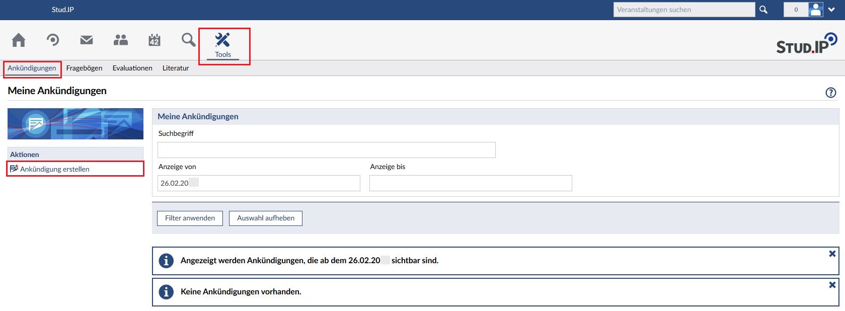 Are there no announcements within a course or an area yet you can see this as well. In this case or if you want to create a new announcement please click on the plus or on the button "create announcement" and do as explained above.