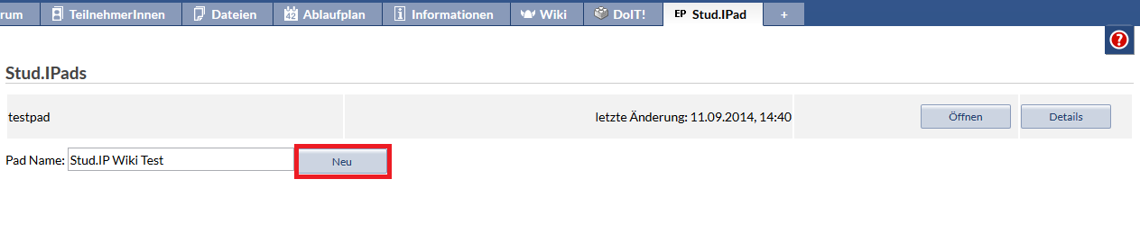 Click on the StudIPad Plugin. You receive an overview for the prepared StudIPads within that course (which are obviously still empty after the activation). You create a new StudIPad by typing into the input field a meaningful name for your StudIPad and subsequently clicking on "new".