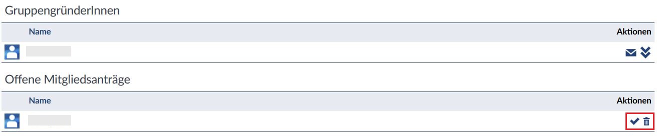 To confirm the application and enroll the respective person into the group you need to choose the tick behin its name.