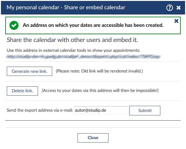 Here you can generate a web addressto let your Stud.IP appointments shown in an external calendar. You can import the web address that got created here in to an external calendar applications to let the appointments be shown there as well. For creating the web address you have to click on "generate address!“ and tipe in the addressinto the other calender applications.