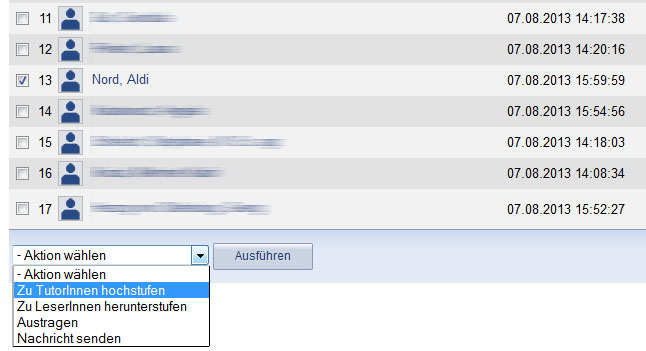 While entering new users you have the possibility to add them directly as tutors if the user is already a 'tutor' within the Stud.IP system. However, it is also possible to add them as an author first and appoint them as a tutor later or vice versa downgrade a tutor to an author (or author to reader – a user without writing permission). In order to appoint or downgrade a user tick the box left of the user in the list. Afterwards you select the action (appoint/downgrade – or “hochstufen/herunterstufen”) from the dropdown box and click on “Execute”.