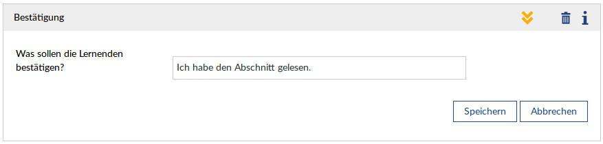 In einer Courseware die sequentiell abgearbeitet werden soll müssen die in einer Sektion enthaltenen Blöcke bearbeitet werden damit das nächste Kapitel aufgerufen werden kann. Da manche Blöcke wie z.B. Freitext-Block, IFrame-Block etc. nur das betrachten als Bestehenskriterium haben, kann mit dem Bestätigungs-Block eine zusätzliches Bestehenskriterium eingefügt werden. Erst wenn der Nutzer bestätigt, dass er die Sektion bearbeitet, gelesen und oder betrachtet hat, wird die Sektion als erfolgreich bearbeitet vermerkt.
