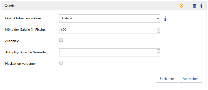 In den Galerie-Blocks werden alle Bilder aus einem Ordner des Dateibereichs in einer Karussellansicht angezeigt. Die Bilder können automatisch wechseln (autoplay) und die Navigationspfeile können ausgeblendet werden.