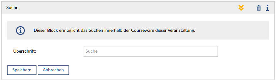 Der Such-Block ermöglicht das Suchen innerhalb der Courseware einer Veranstaltung. Dieser Block kann sowohl in Sektionen als auch in der Sidebar verwendet werden.